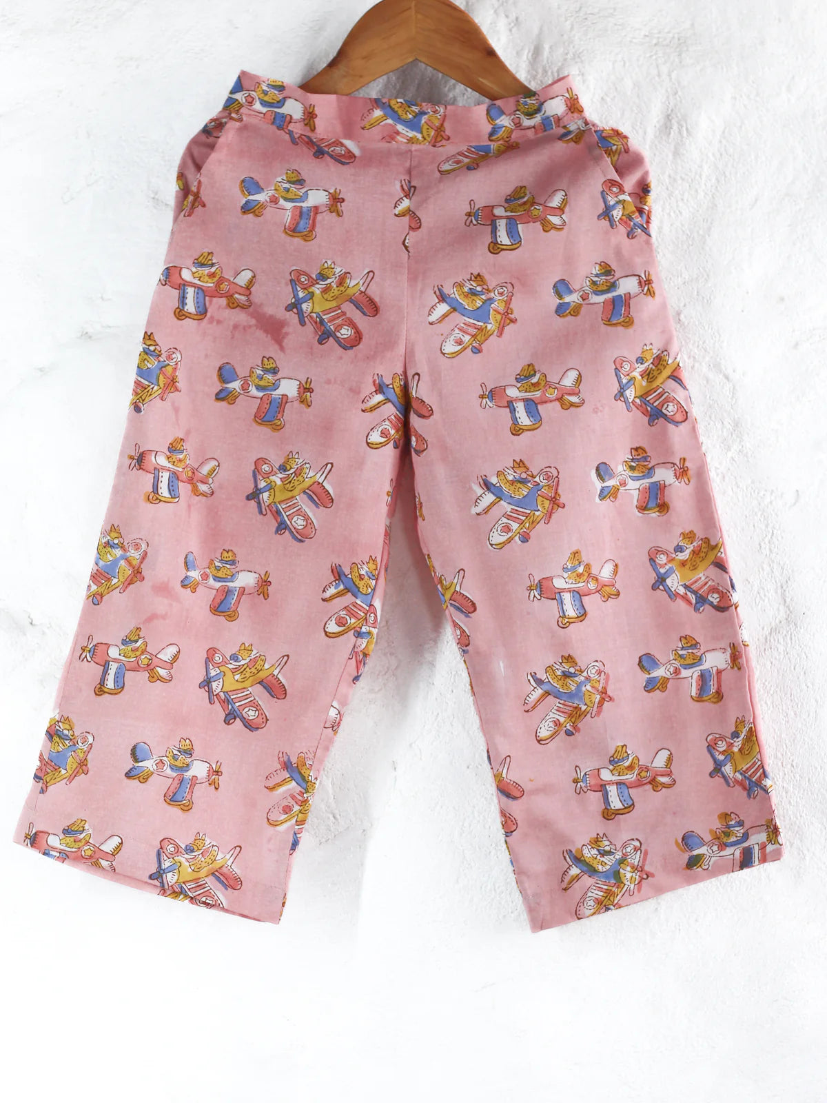 Made from soft cotton, this Pink Plane Top & Pant Set offers a comfortable fit in a gentle pink hue. Featuring a plain design with subtle hand block printing, it comes as a coordinated pair, perfect for everyday wear that combines style and ease.