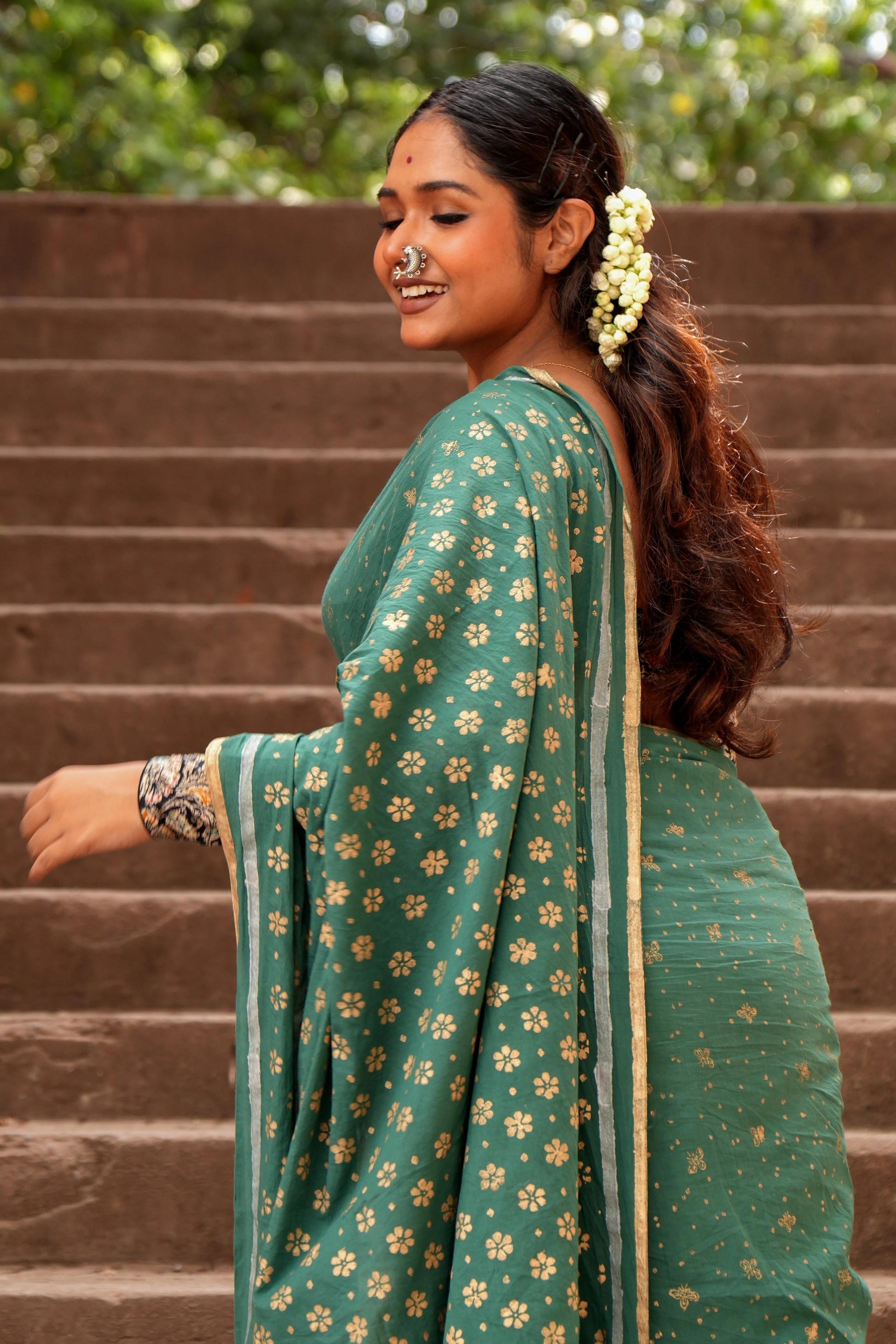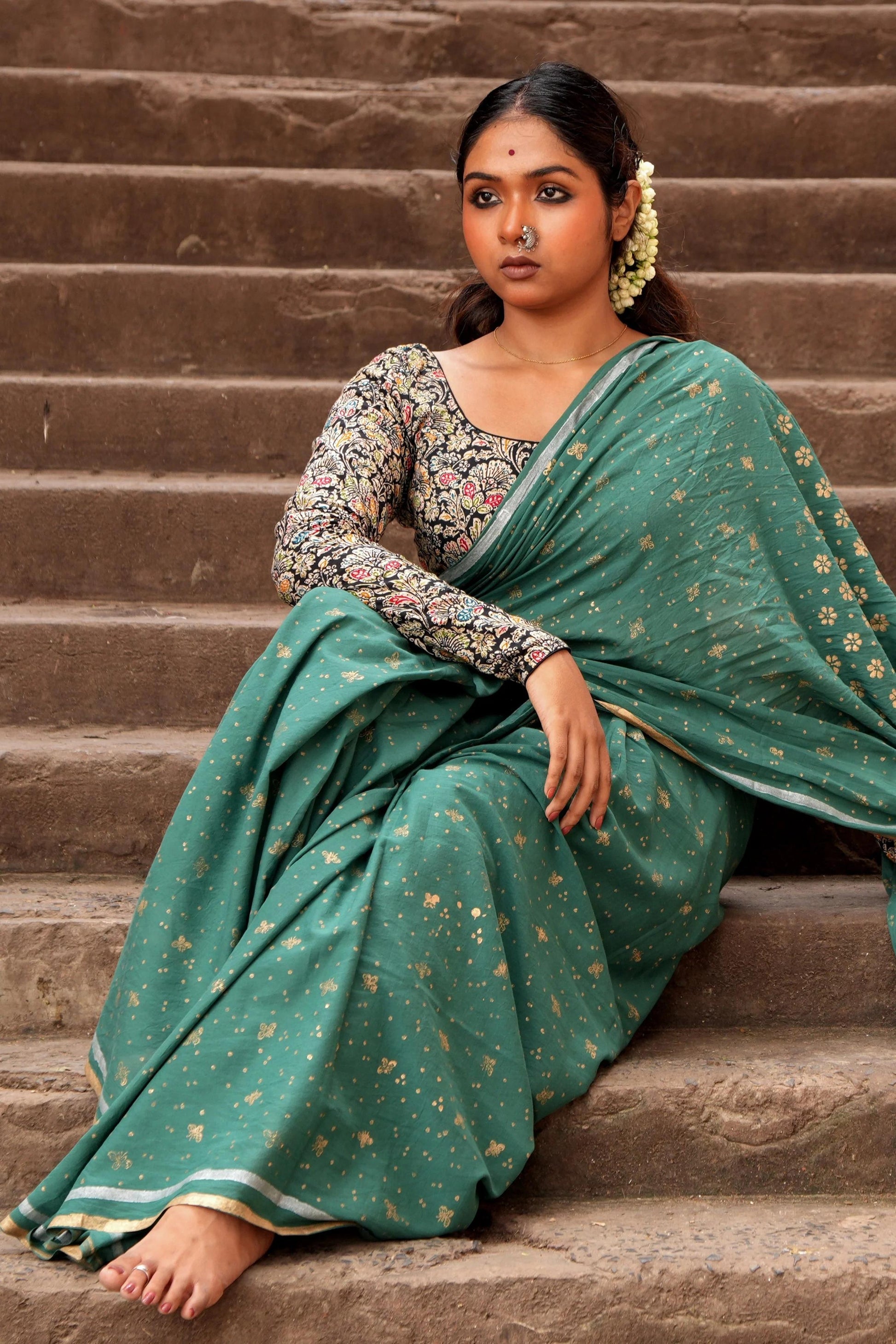 Each saree is approximately 5.5 m in length and 45 inches in width. All sarees come with an 80 cm unstitched blouse piece, edging & tassels. At Mogasu, apparel is hand-dyed and hand-blocked printed by skillful artisans with love and precision. You might notice some imperfections - a testimony to the 100% original hand-printing techniques. The colours might slightly differ due to lighting and photography.