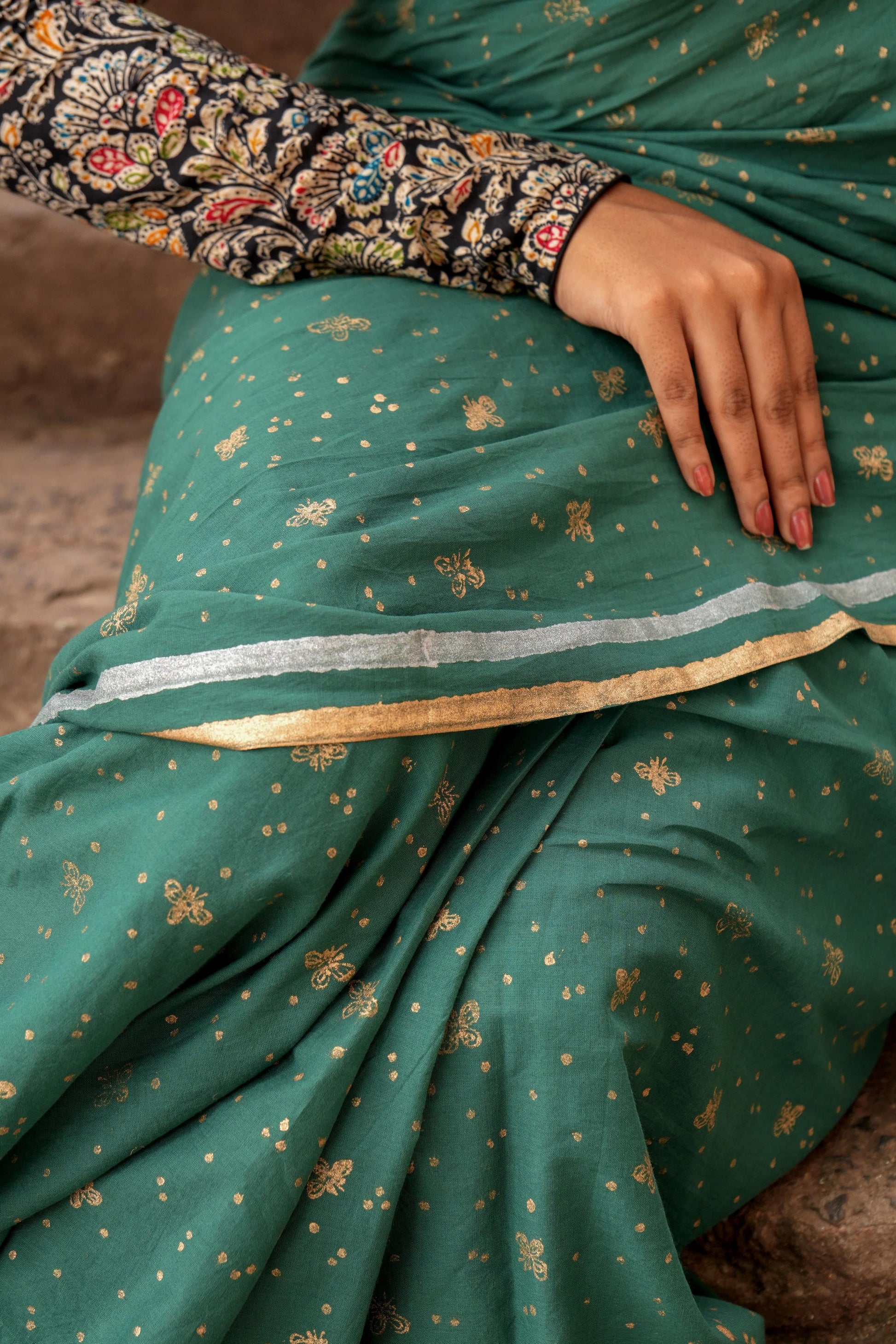 Say hello to Cazulo, a saree that brings the magic of Goa’s night sky to your wardrobe. Handcrafted with love, this dark green mul cotton saree is sprinkled with gold and silver foil motifs that shimmer just like fireflies do when they come alive under moonlight. The colour? Inspired by the deep greens of Goan trees, where these little glowing wonders love to play.