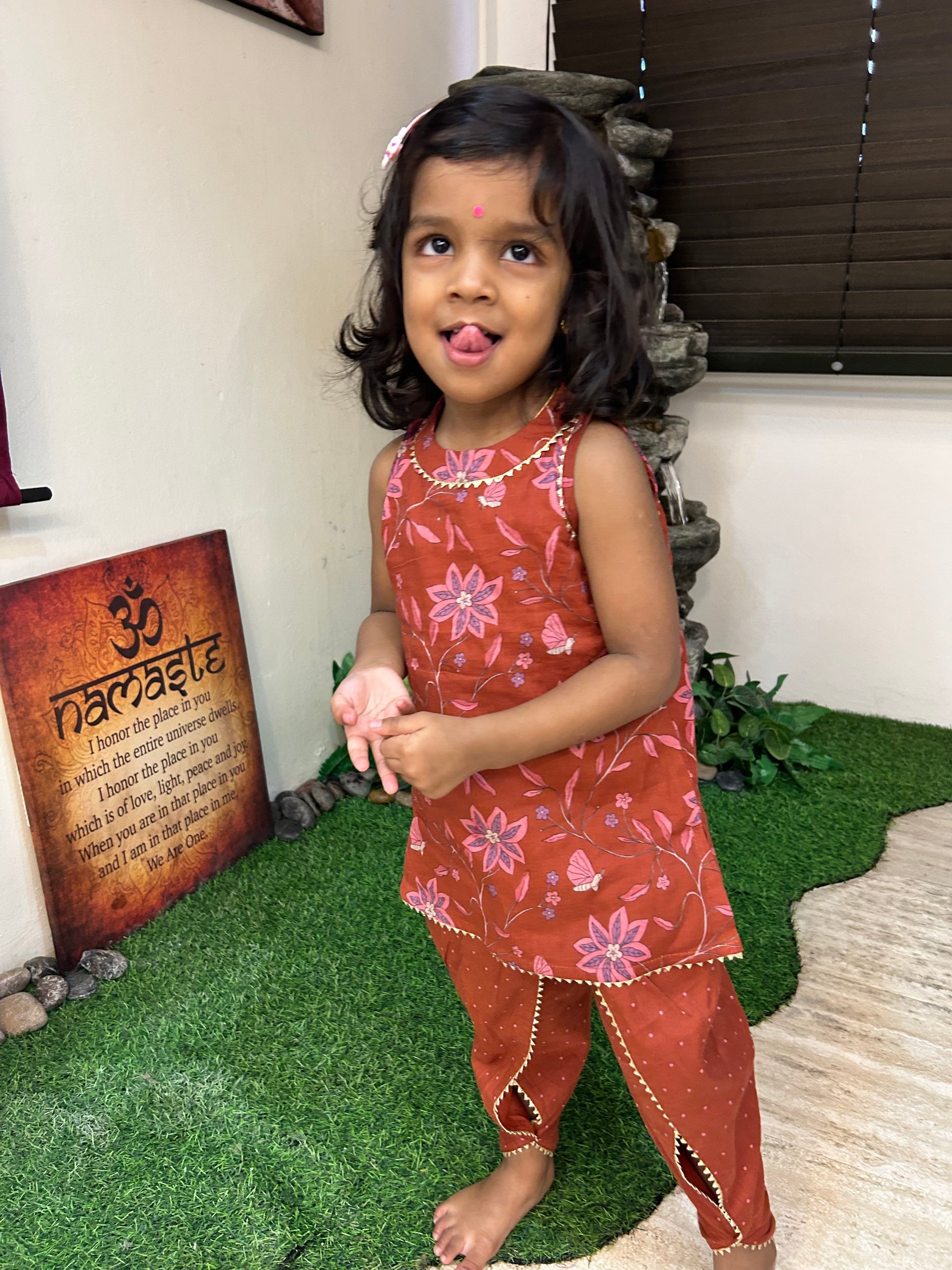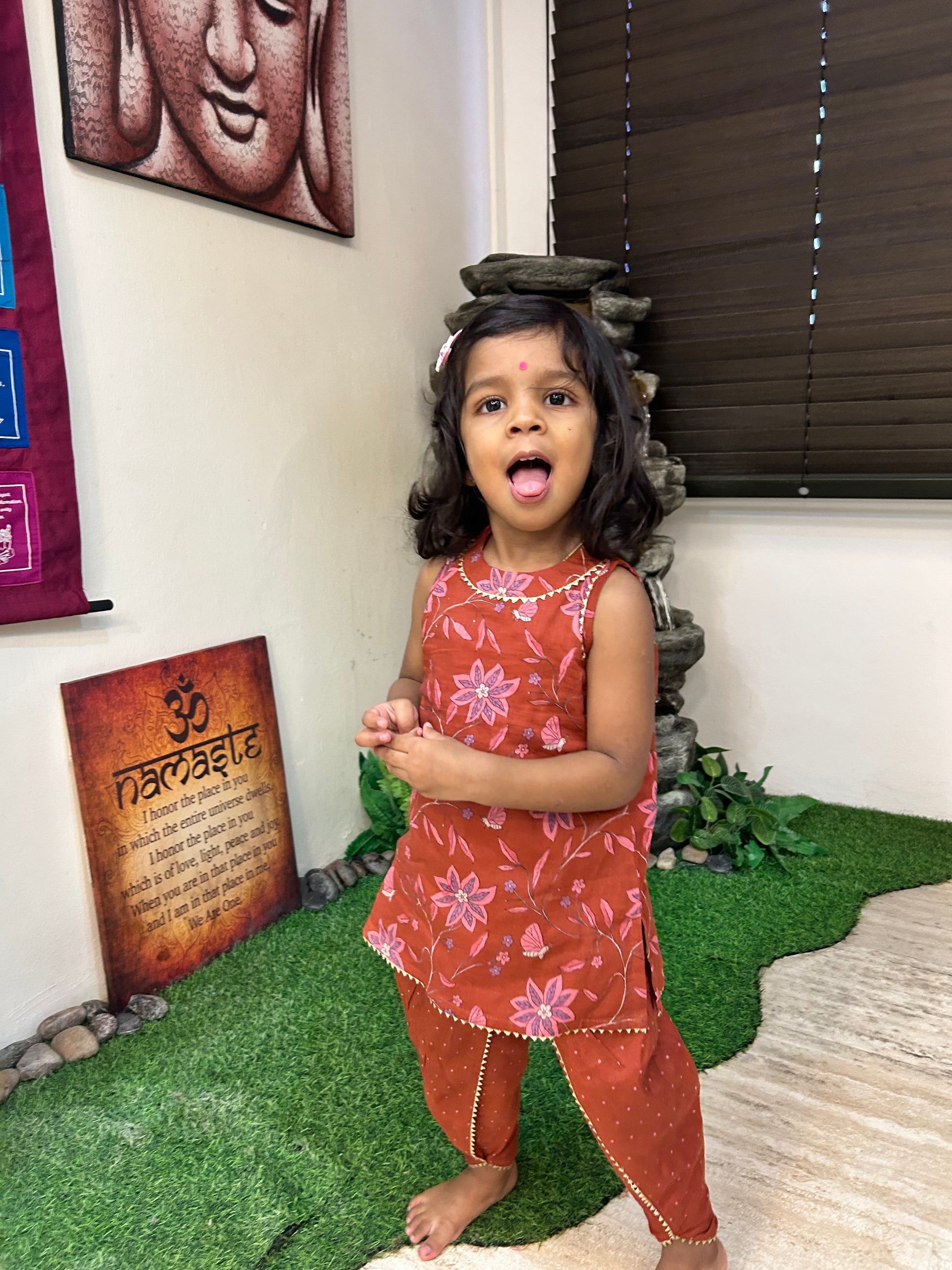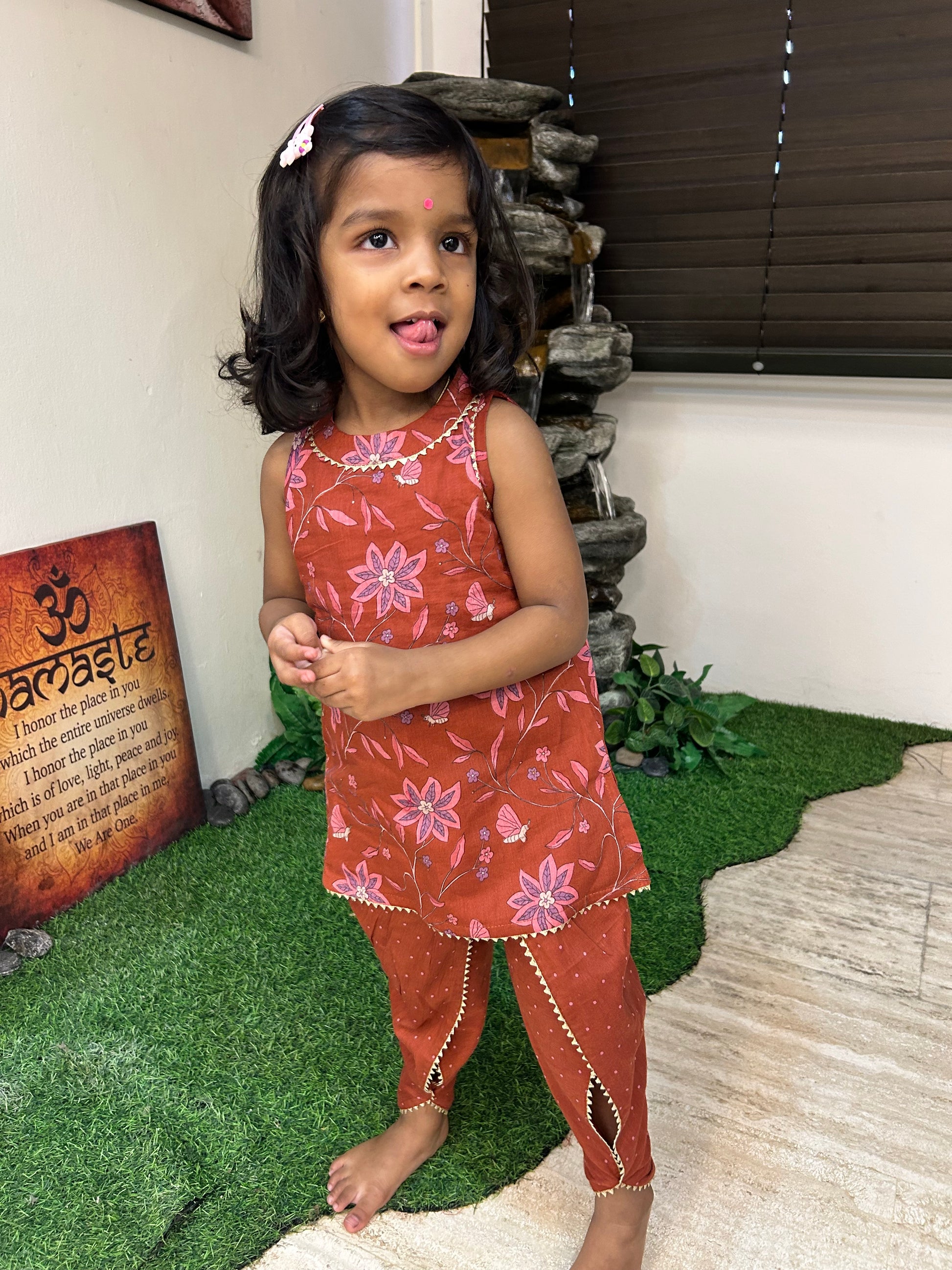 Adorn your little girl in the Gungun, a delightful maroon cotton kurta featuring vibrant floral patterns paired with playful polka-dotted pants. "Gungun" signifies a playful charm, perfect for everyday adventures.