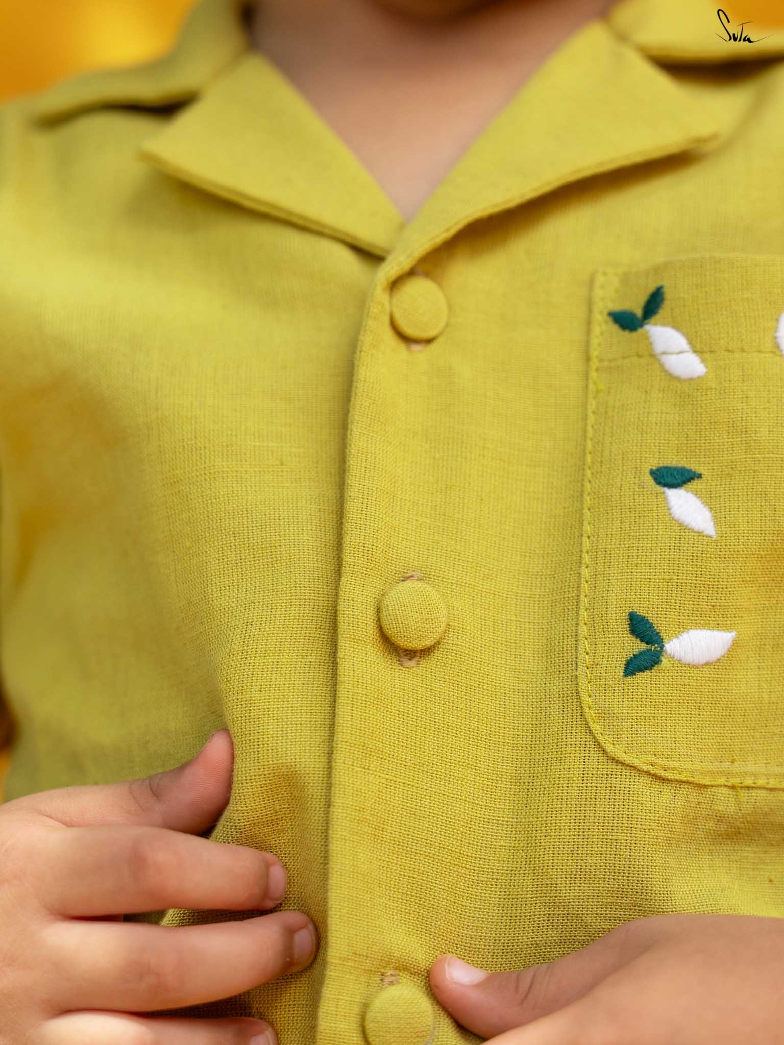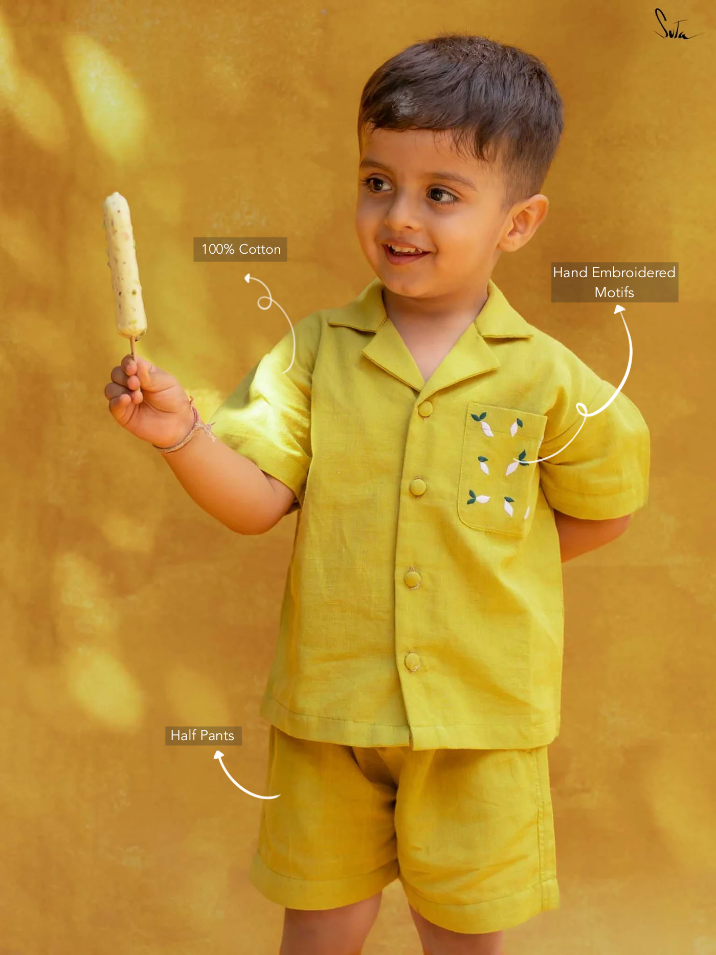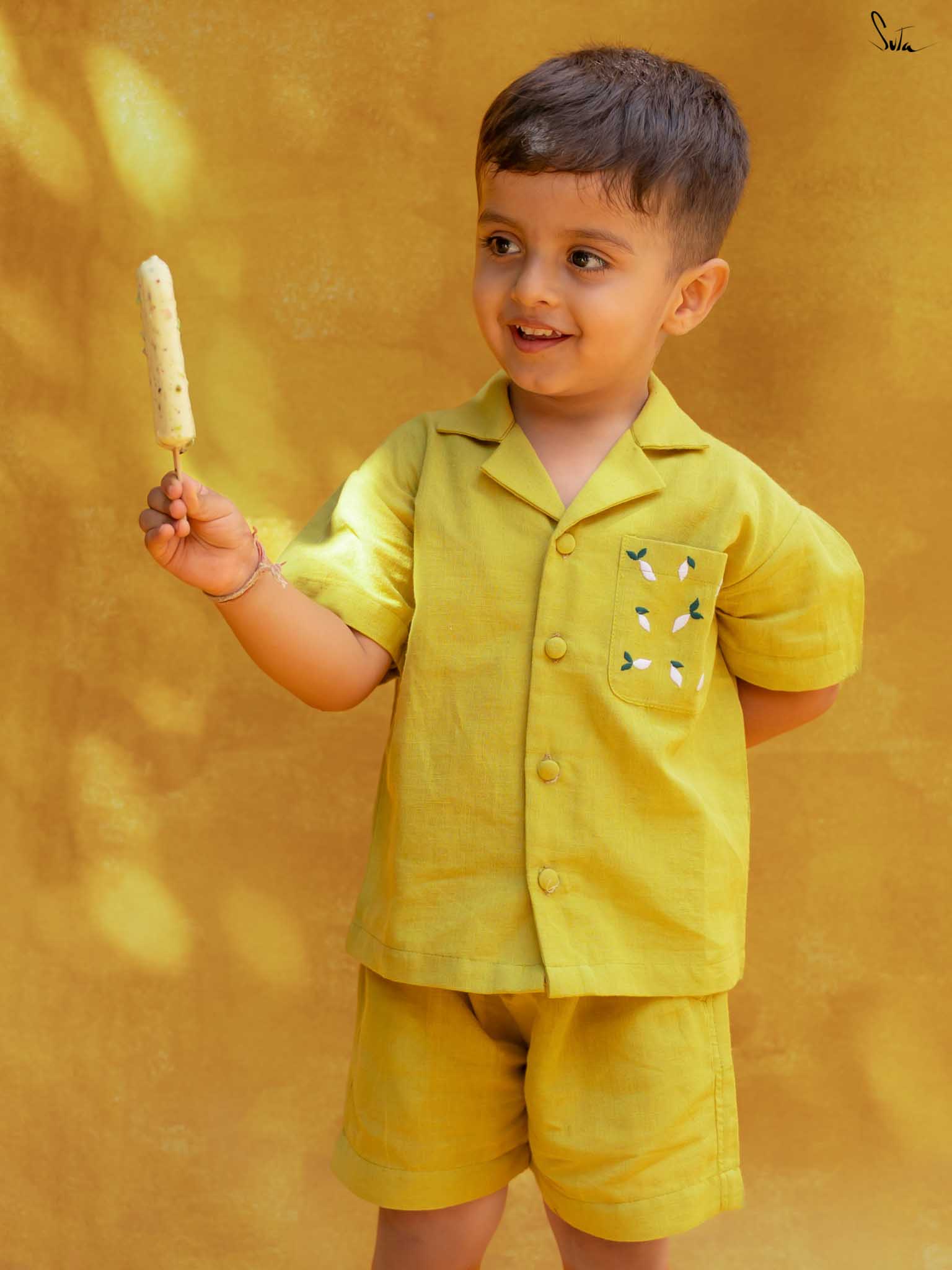 This adorable Suta outfit for boys features a cheerful mustard-yellow co-ord set made from soft, breathable cotton — perfect for warm days and active play. The set includes a half-sleeved shirt with a classic camp collar and front buttons, paired with matching shorts for easy movement. A touch of charm comes from the cute embroidered detail on the shirt pocket, adding subtle character without overpowering the simplicity of the design.